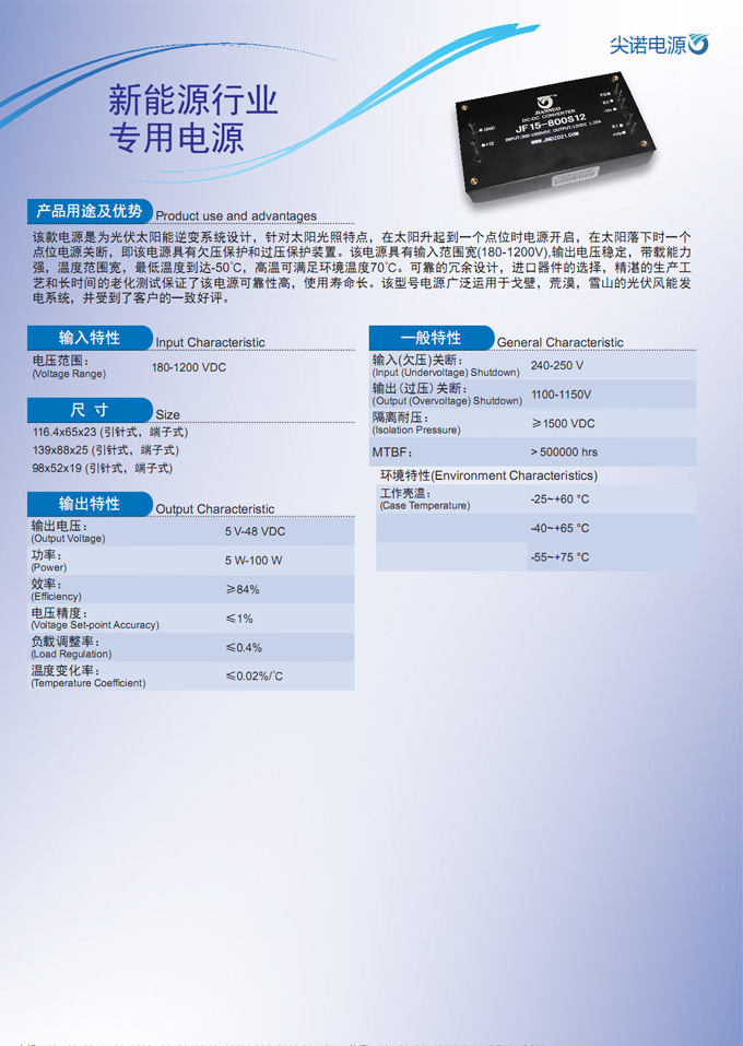 該款電源是為光伏太陽能逆變系統(tǒng)設計,針對太陽光照特點,在太陽升起到一個點位時電源開啟,在太陽落下時一個 點位電源關斷,即該電源具有欠壓保護和過壓保護裝置。該電源具有輸入范圍寬(180-1200V),輸出電壓穩(wěn)定,帶載能力 強,溫度范圍寬,低溫度到達-50℃,高溫可滿足環(huán)境溫度70℃??煽康娜哂嘣O計,進口器件的選擇,精湛的生產(chǎn)工 藝和長時間的老化測試保證了該電源可靠性高,使用壽命長。該型號電源廣泛運用于戈壁,荒漠,雪山的光伏風能發(fā) 電系統(tǒng),并受到了客戶的一致好評