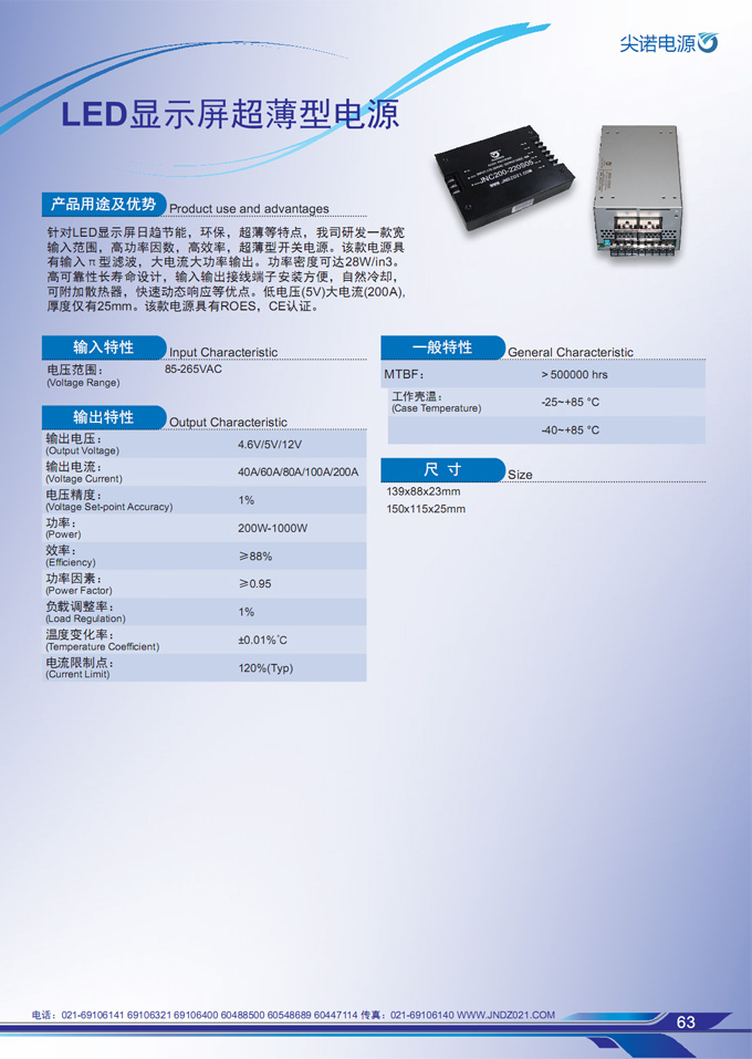 針對LED顯示屏日趨節(jié)能,環(huán)保,超薄等特點,我司研發(fā)一款寬 輸入范圍,高功率因數,高效率,超薄型開關電源。該款電源具 有輸入π型濾波,大電流大功率輸出。功率密度可達28W/in3。 高可靠性長壽命設計,輸入輸出接線端子安裝方便,自然冷卻, 可附加散熱器,快速動態(tài)響應等優(yōu)點。低電壓(5V)大電流(200A), 厚度僅有25mm。該款電源具有ROES,CE認證